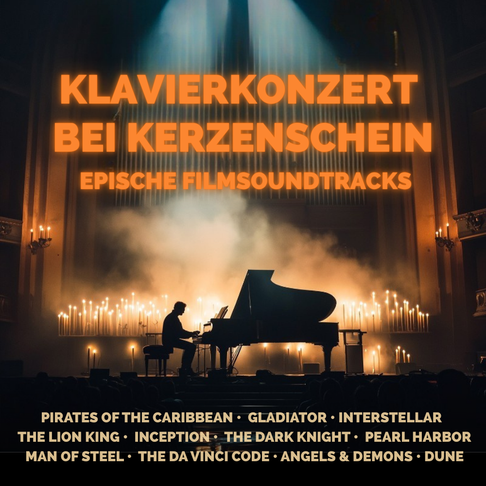 Ein Konzertabend in besonderer Atmosphäre: Im warmen Licht hunderter Kerzen erklingen die bekanntesten und eindrucksvollsten Melodien der Filmgeschichte – neu interpretiert am Klavier.